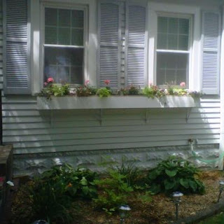 I'm outside in the front yard, looking at the house, glass of wine in hand, contemplative look on face. CH sees me and yells from window, "What are you thinking about doing NOW?!?" I pause. I normally don't like to let him in on my plans until they are fully formed and halfway executed. "I think we need a big windowbox on the front of the house. Like the ones we saw in Martha's Vineyard, with the big, trailing flowers." I hear a large sigh of exasperation. "We don't need a big windowbox. It will tear the front off of the house." At this point, I know he is not on board yet. I take measurements.